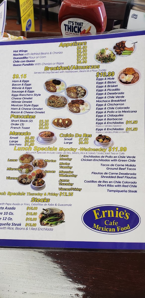 Welcome to Ernie's Cafe Bar & Grill, a vibrant gem nestled at 1506 N Zaragoza Rd in El Paso, TX. Specializing in Mexican cuisine, this restaurant seamlessly blends traditional flavors with a welcoming atmosphere. The extensive menu features delightful offerings from enchiladas to fajitas, catering to both brunch lovers and dinner enthusiasts alike. The Monster Burger, layered with bacon, ham, and cheese, stands out for those seeking a hearty option. Reviews highlight the consistently exceptional service, with patrons appreciating both the flavorful dishes and the comfort of the space.